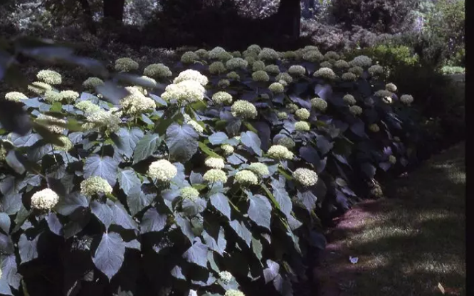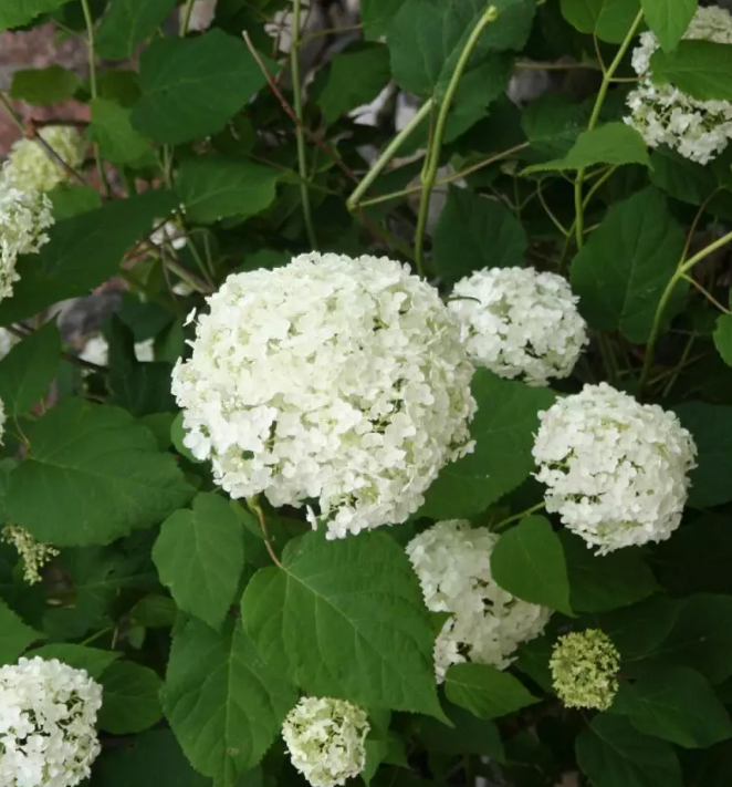 安娜贝尔AnnabelleHydrangea 这种白色的绣球花Hydrangeaarborescens是早期最受欢迎的绣球。白色大花球,可以忍受荫,而且极易生长,因此常被种在墙边,甚至树下。也经常被当作围篱种植,因为植株矮小又可以大剪。入冬时甚至可以剪到地面。