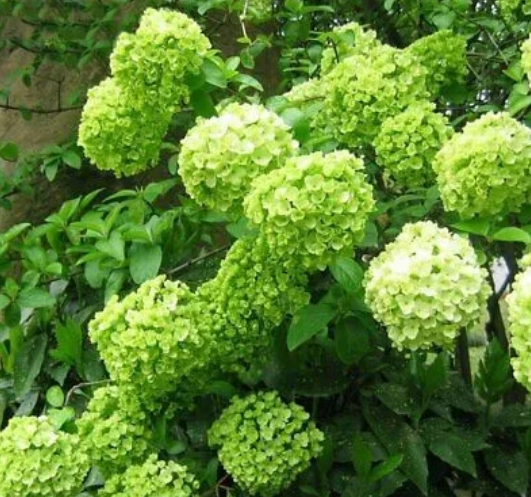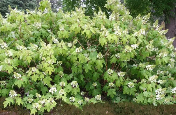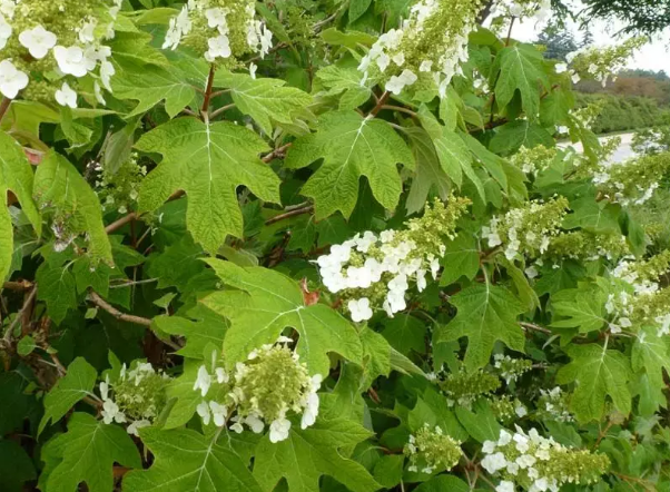 橡树叶绣球 有一种绣球的叶子不是椭圆形而有些像橡树的叶子,所以叫oak leafhydrangea。这一类绣球Hydrangeaquercifolia的花多半是锥形状,不过也有圆形的。图中的是一株灌木,而绿色花较小,只二、三寸左右直径。