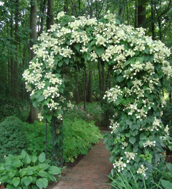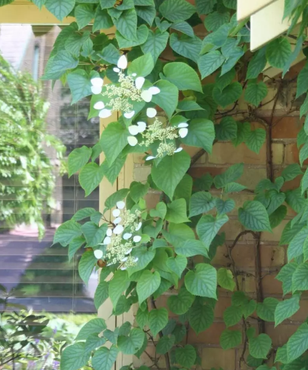 攀爬式绣球 这一类绣球Hydrangea petiolaris最高可以长到50尺,叶子与一般绣球一样的椭圆及有尖,但花朵是平面,而非球状。一般外边的花朵较像花,内心就很小。不过对比就很好看,及具特色。