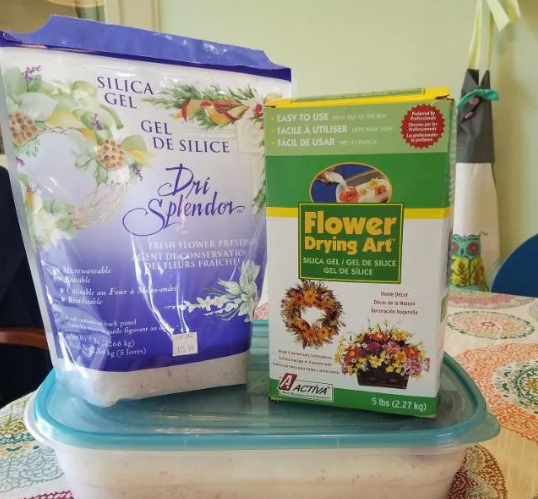 4,用矽胶SilicaGel做干花,是被使用了几百年的方式。前面几种方式可能无法百分百保存花朵原来的颜色,但用矽胶就可以。通常用矽胶时都将花朵剪下,如果你要保留枝茎,可以在干花做好后,再用花店出售的绿色胶布将花朵与枝茎胶合起来。