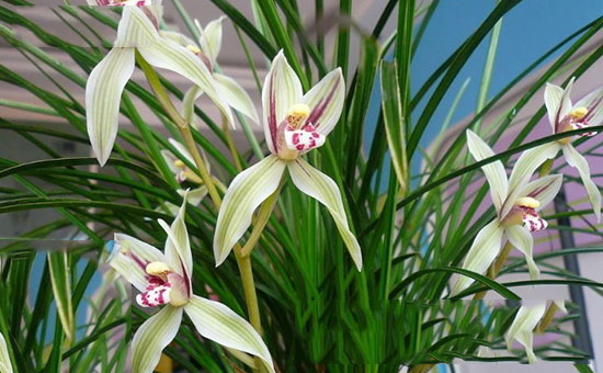 墨兰(报岁兰):我国台湾、福建、广东、广西等省区有分布,叶质细嫩宽大光滑,肉质根,球茎不明显,叶边缘无锯齿。多花系,春天开花,花香或微香。